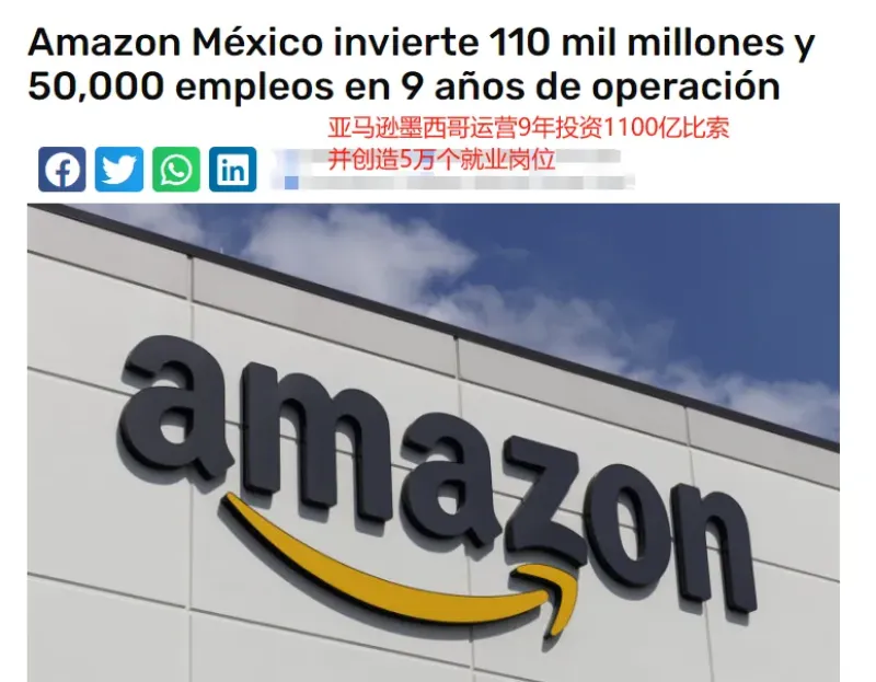 根據(jù)亞馬遜最近發(fā)布的《從頭到尾:亞馬遜在墨西哥的影響》報告,自2015年成立起來,在這9年時間里,亞馬遜在墨西哥投資了1100億比索(約合55.16億美元),主要涵蓋物流、建筑、電子商務(wù)、技術(shù)和就業(yè)等各個領(lǐng)域。