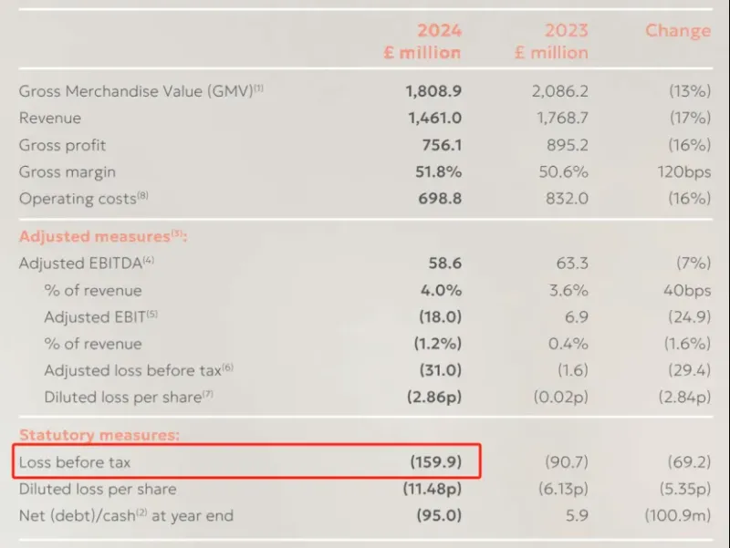 在截至2024年2月全年財報中,Boohoo總營收14.61億英鎊,同比下降17%,稅前虧損增加76%至1.6億英鎊。另外在截至今年8月底的6個月內,Boohoo銷售額下降15%至6.2億英鎊,英國、美國等核心地區(qū)業(yè)績均出現(xiàn)下滑。
