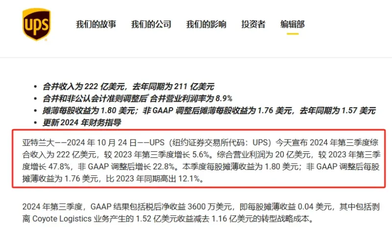 日前,UPS發(fā)布了2024年第三季度財報。財報顯示,這一季度公司營收222億美元,同比增長5.6%;綜合營業(yè)利潤為20億美元,同比大漲47.8%。這也是近18個月以來,UPS收入和利潤首次恢復(fù)增長。