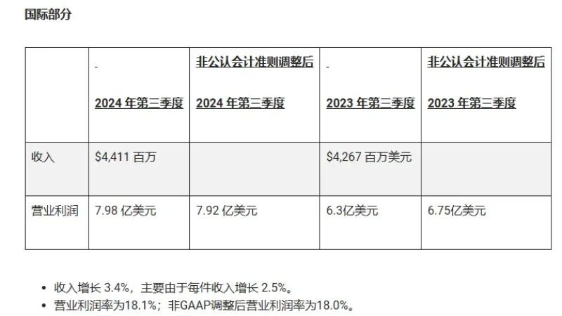 除了美國國內(nèi)業(yè)務(wù)增勢強(qiáng)勁外,國際業(yè)務(wù)的表現(xiàn)也沒讓人失望。第三季度,國際業(yè)務(wù)收入為44.11億美元,同比增長3.4%;營業(yè)利潤為7.98億美元,營業(yè)利潤率為18.1%。另外,供應(yīng)鏈業(yè)務(wù)收入同比增長5%至3.384億美元,這主要受空運和海運業(yè)務(wù)增長等推動的。