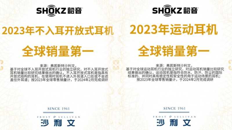比如國產耳機品牌Shokz。在北美、歐洲等主要市場上,Shokz的名聲都可以說是十分響亮。根據市場調查機構沙利文的數據,2023年Shokz以435萬臺、520萬臺的銷量成績,分別拿下了全球運動耳機銷量冠軍和全球不入耳開放式耳機銷量冠軍。