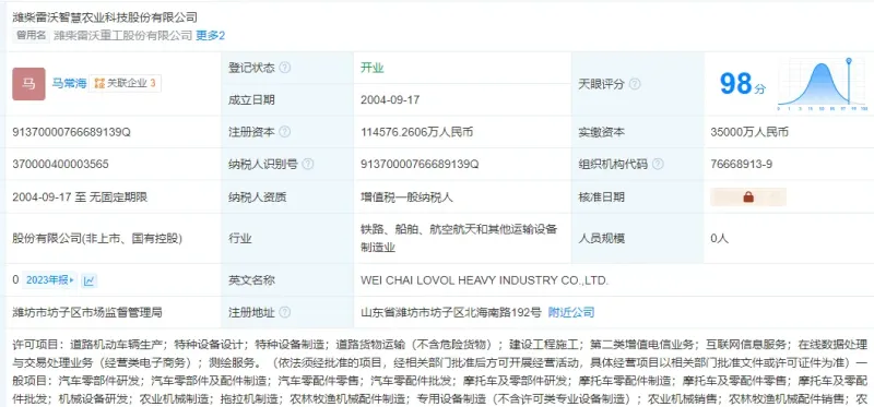 作為國內知名的農業機械企業,雷沃重工LOVOL就是其中之一。天眼查顯示,LOVOL隸屬于濰柴雷沃智慧農業科技股份有限公司,總部位于山東濰坊,旗下擁有動力總成、車輛、工程機械、智能物流、農業裝備、海洋運輸裝備等業務板塊。