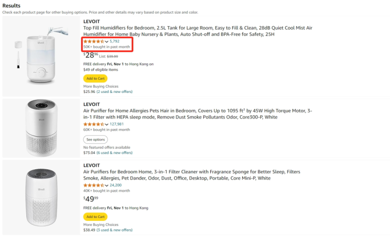 舉例來說,在亞馬遜上,品牌LEVOIT的一款加濕器銷量就十分漂亮,據(jù)數(shù)據(jù)顯示,該款加濕器在上個月售出超5萬件,平均每天賣出1000多件。
