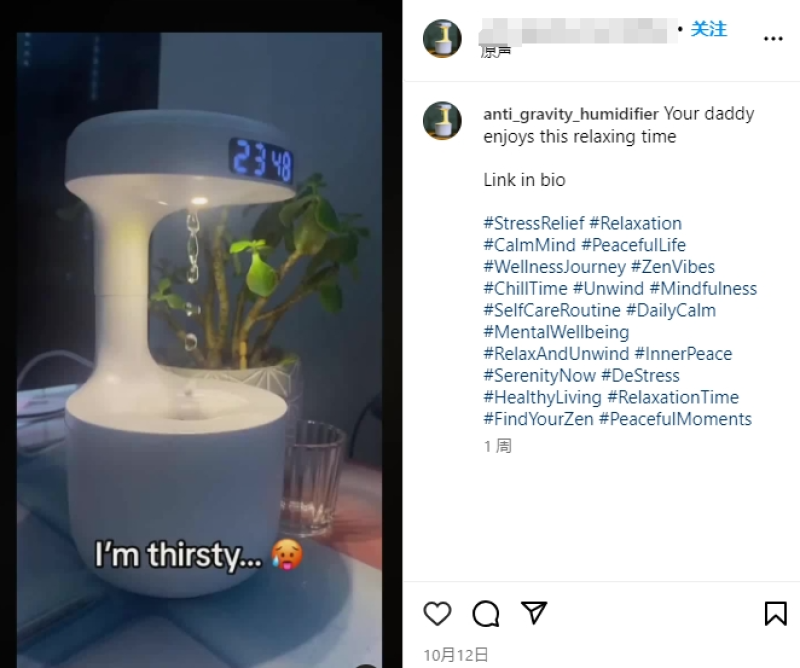 由于奇特的結(jié)構(gòu),該產(chǎn)品除了在TikTok上獲得關(guān)注之外,在很多社交平臺引起了圍觀,例如在instagram上同樣有網(wǎng)友分享這一加濕器,熱度也比較可觀。