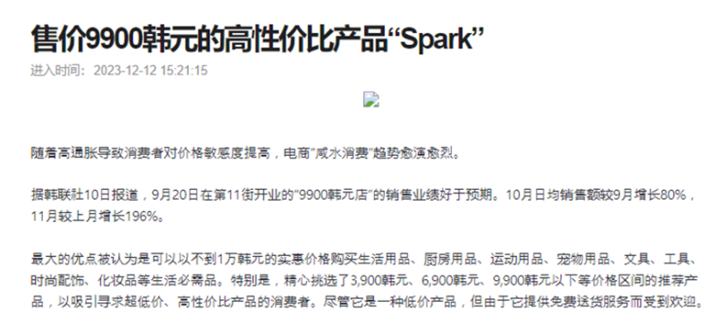 2023年9月,11Street率先出擊,推出了“9900韓元店鋪”板塊,主要銷售單價低于1萬韓元的生活用品。店鋪一經(jīng)上線顧客就絡(luò)繹不絕,當(dāng)月銷售額便超出預(yù)期;隨后10月份的日銷售額環(huán)比增長了80%,11月份更是猛增了196%。