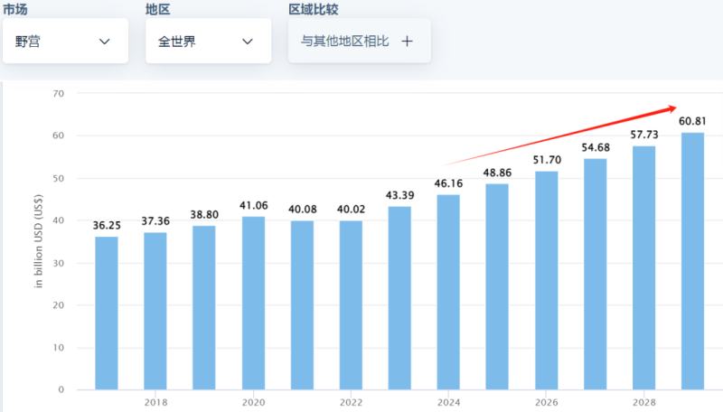 有需求才能推動品牌的發展,Flextail的騰飛離不開市場需求的托舉。來自Statista發布的數據顯示,2024年,全球露營市場的收入將達到461.6億美元,這一數字到2029年有望達到608.1億美元,預測期內年復合增長率為5.67%。