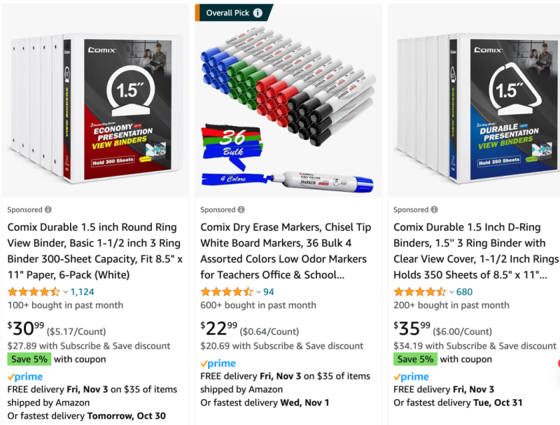 舉例來說,Comix是亞馬遜文具類目知名品牌,是齊心集團(tuán)的文具大賣,產(chǎn)品包括活頁夾、馬克筆、計(jì)算器等,在亞馬遜中的銷量排名也一直很不錯(cuò)。