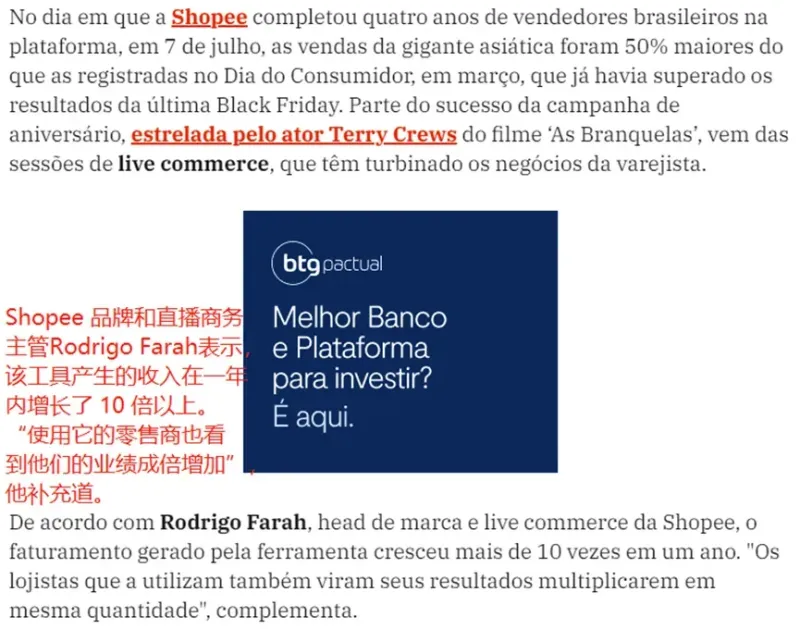 比如Shopee加快發揮自身直播電商的優勢,邀請當地明星主持直播并舉辦一些主題直播活動,同時每天會進行約400場直播帶貨。據統計,在過去一年中,Shopee巴西站通過直播電商業務達成的收入增長了超過10倍。