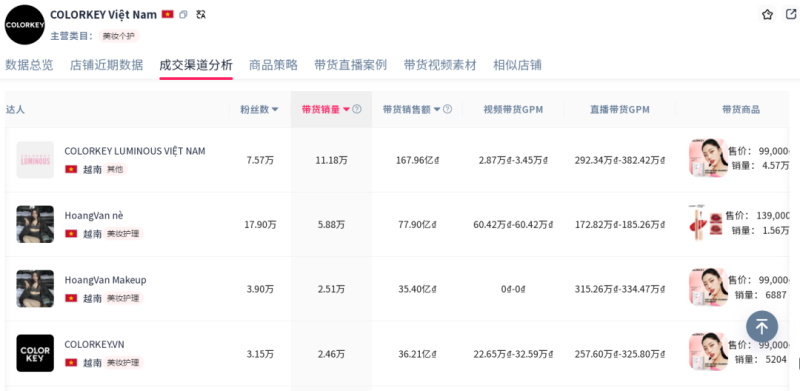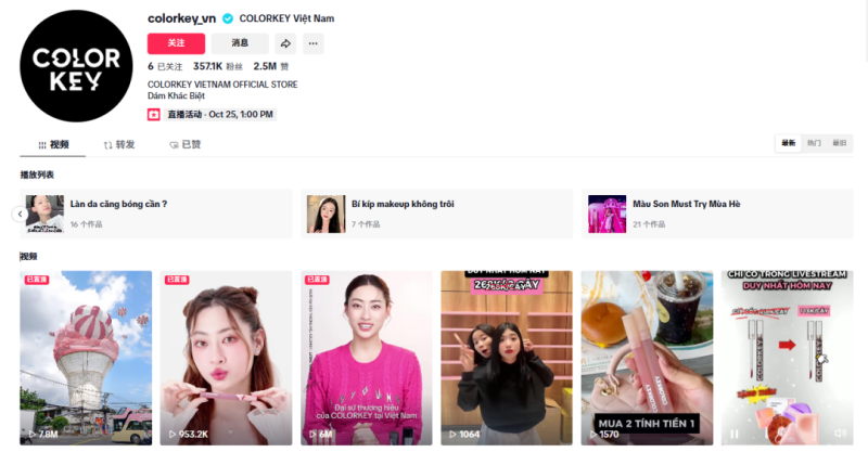 中國(guó)美妝品牌珂拉琪(Colorkey)便是其中一員。尤其是其在越南市場(chǎng),珂拉琪小店之一“COLORKEY Vi?t Nam”,賬號(hào)@colorkey_vn粉絲量有35.7萬,發(fā)布視頻共2500條,獲贊量達(dá)到250萬個(gè)。截至目前,該店鋪商品總數(shù)量達(dá)到129款,總銷量180萬,總GMV達(dá)到1176萬美元,在今年6月至8月的三個(gè)月時(shí)間里,珂拉琪還接連霸榜類目與平臺(tái)站點(diǎn)Top 1。