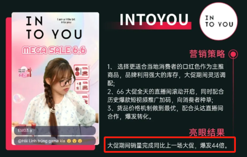 在6.6越南電商大促中,越南帶貨主播武河玲(V? Hà Linh)直播帶貨4小時(shí),創(chuàng)下單場(chǎng)銷售額達(dá)400萬美金的歷史新紀(jì)錄。在這份成績(jī)單上,卡姿蘭、橘朵等中國(guó)彩妝品牌的表現(xiàn)相當(dāng)亮眼。在TikTok Shop6.6東南亞生日大促中,INTOYOU成了超級(jí)熱賣品,大促期間,品牌銷量相比上一場(chǎng)大促,同比激增44倍。