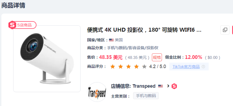 根據(jù)Shoplus超店有數(shù)的數(shù)據(jù),一款家庭投影儀憑借其出色的性能和親民的價格,成功沖上美國TikTok熱銷商品榜二位置,日銷售額突破20萬美元,一天賣了4000多單。