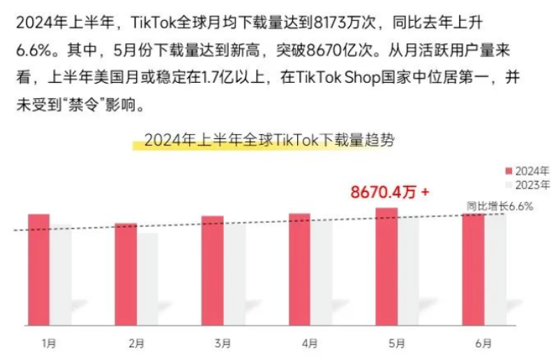 來自Shoplus超店有數(shù)發(fā)布的一份《2024年上半年TikTok電商數(shù)據(jù)報告》顯示,2024年上半年,TikTok全球月均下載量達到了驚人的8173萬次,同比去年實現(xiàn)6.6%的漲幅。其中,五月份的下載量直攀高峰,突破了8670億次。盡管此前身處禁令危機之中,TikTok依然穩(wěn)定發(fā)揮,美國月活躍用戶量穩(wěn)定在1.7億以上。