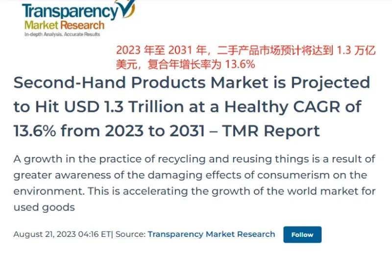在這樣的消費趨勢下,全球二手轉售市場價值一路飛漲。根據Transparency Market Research的數據,2023年至2031年期間,全球二手轉售市場的復合年增長率預計將為13.6%,到2031年市場規模有望增長到1.3萬億美元。