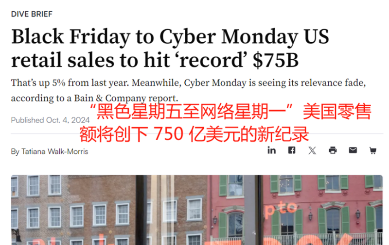各大平臺摩拳擦掌,消費者也已然爆發(fā)出了很高的購物熱情。一份來自貝恩的研究報告顯示,今年黑五網一大促活動期間,美國的零售額預計將同比增長5%到750億美元,刷新歷史紀錄。
