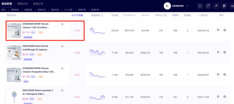 據Echotik數據顯示,HAN RIVER在TikTok印尼小店中,近30天內銷量超過8萬件,成交金額高達80萬美金,上個月GMV排名第一的單品是一款5合1無繩便攜式吸塵器,近1個月售出超3萬件,銷量相當高。