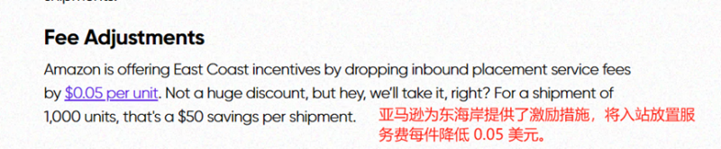 此外,亞馬遜還推出了一項有關物流費率的臨時措施,承諾只要賣家將貨物發送往美國東部地區,其使用“最小分批發貨”的入站放置服務費每件就能下調5美分,雖然不是很多,但每1000件貨物賣家也能節省50美元左右的成本。