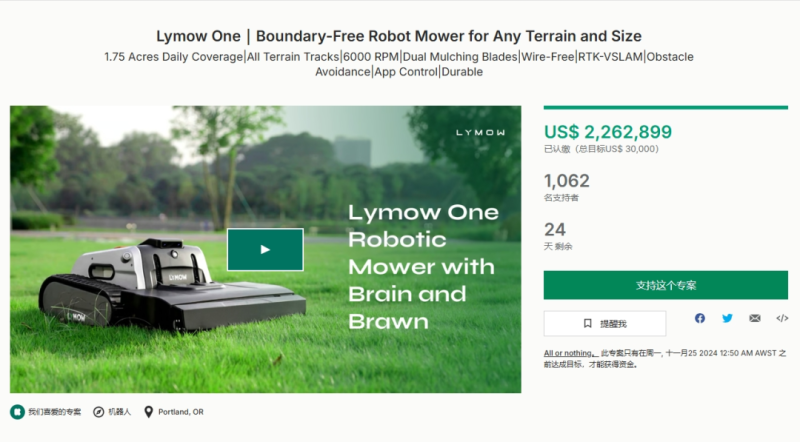 就在10月,又有一款創(chuàng)新型智能割草機器人上線?Kickstarter 眾籌,它就是Lymow One 無埋線全地形越野割草機器人。據了解,該產品上線僅10天即籌得超過180萬美金,截至目前,籌集的資金更是突破了226萬美金。