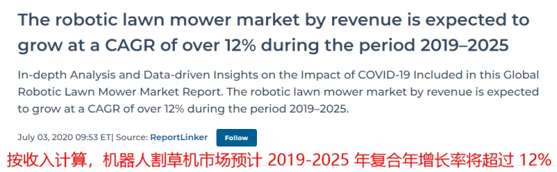 據此前Report Linker發(fā)布的一項研究數據顯示,在2019年至2025年期間,全球割草機器人這一細分市場的復合年增長率預計會超過12%,增長相當迅猛。