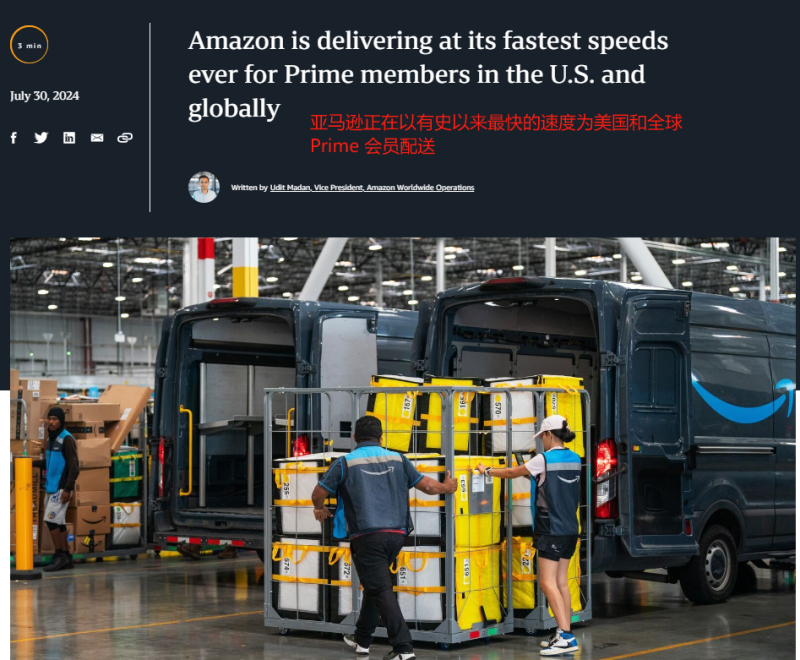以全球電商巨頭亞馬遜為例,不久前亞馬遜全球運(yùn)營副總裁Udit Madan就分享稱,今年截至2024年7月30日,亞馬遜在全球范圍實(shí)現(xiàn)有史以來最快的Prime配送速度,全球當(dāng)日或次日達(dá)商品超過50億件,同比增長超30%。