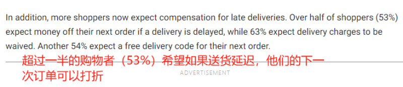 具體來說,超過一半的美國消費(fèi)者(53%)希望在他們訂單未及時送達(dá)的情況下,他們的下一筆訂單可以獲得一定的折扣;63%的消費(fèi)者則希望能直接免除延誤訂單的送貨費(fèi);另外還有54%的消費(fèi)者希望在下一次下單時能獲得免費(fèi)的送貨代碼。