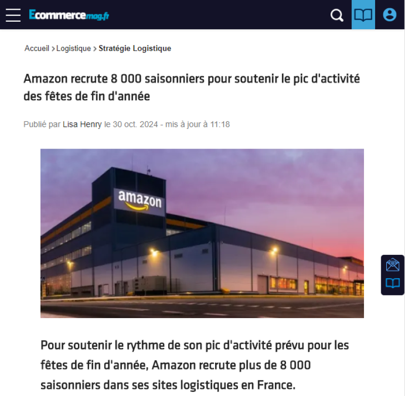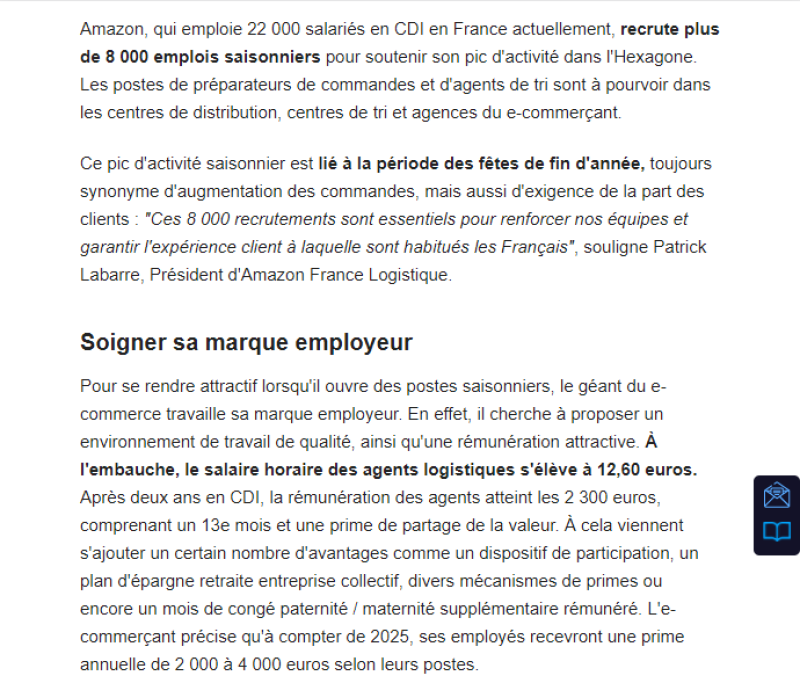 為確保這些崗位的吸引力,亞馬遜法國將時薪設定為12.60歐元,超過11月1日開始實行的最低工資11.88歐元,同時也希望通過這些季節性工作進行長期招聘。亞馬遜為長期員工提供具備市場競爭力的薪資待遇。簽訂兩年永久合同后,物流代理的薪酬將接近2300歐元,并享受第13個月的獎金、股份分紅計劃、退休所得稅等福利。自2025年起,亞馬遜還將根據崗位不同,為員工提供2000至4000歐元的年度獎金。