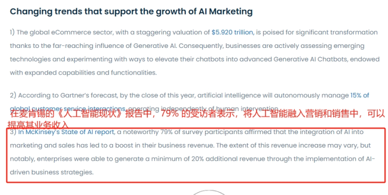 從數(shù)據(jù)上看,根據(jù)麥肯錫公布的人工智能狀況報(bào)告顯示,在受訪者中,有79%的人都表示“將人工智能融入營銷和銷售中可以增加業(yè)務(wù)收入。”雖然對于不同的企業(yè)來說,增長幅度各不相同,但總體而言,通過AI驅(qū)動的商業(yè)戰(zhàn)略,能夠?yàn)槠髽I(yè)帶來至少20%的額外收入。