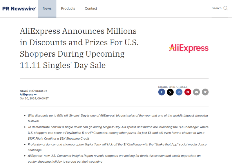 此次雙十一設立了三天預熱期,將于11月8日提前啟動,美國消費者將有機會享受一系列的特別促銷活動。其中包括1美元挑戰(1美元的價格購買指定商品)、Unreal Deals(每日都有機會獲得視頻游戲、相機和筆記本電腦等獎品)、以及由Klarna贊助的“The Mega Deal”抽獎活動(有機會贏取1萬美元航班積分或3000美元AliExpress購物積分)。