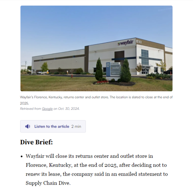 文章來(lái)源于互聯(lián)網(wǎng):Wayfair將于2025年底關(guān)閉弗洛倫斯退貨中心