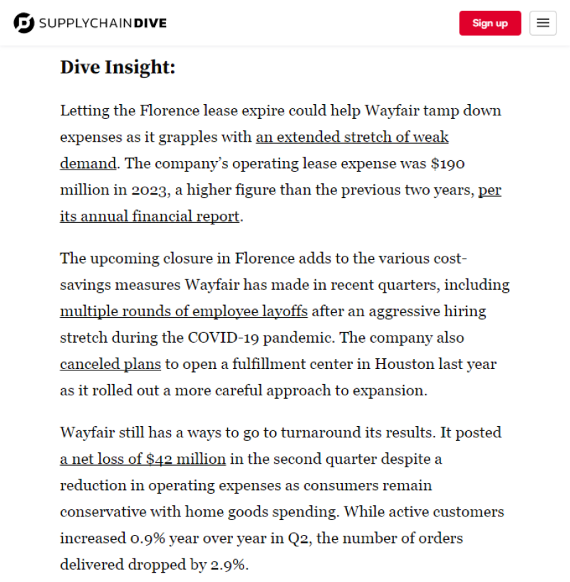 此次佛羅倫薩分店的關(guān)閉是Wayfair最近幾個(gè)季度實(shí)施的成本削減舉措之一,包括在疫情期間進(jìn)行多次裁員,努力降低運(yùn)營(yíng)費(fèi)用。此外,該公司還取消了去年在休斯頓開(kāi)設(shè)配送中心的計(jì)劃,采取更為謹(jǐn)慎的擴(kuò)張方式。