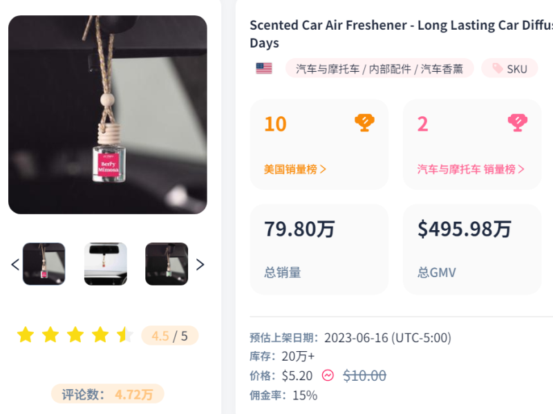 從去年6月上架至今,這款車載香薰銷量已經接近80萬件,預估總銷售額突破495萬美金。而且直到現在,這款香薰也依然位列TikTok美區銷量榜第十。