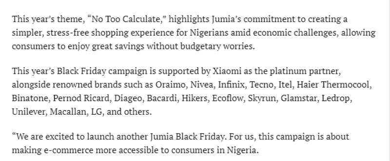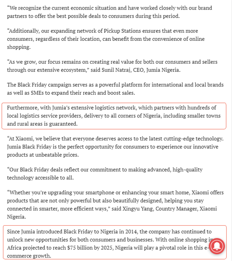 黑色星期五活動為國際和本地品牌以及中小企業提供了一個強大的平臺,幫助他們擴大影響力并提高銷量。此外,Jumia 擁有廣泛的物流網絡,與數百家本地物流服務提供商合作,確保將商品配送到尼日利亞的各個角落,包括小城鎮和農村地區。