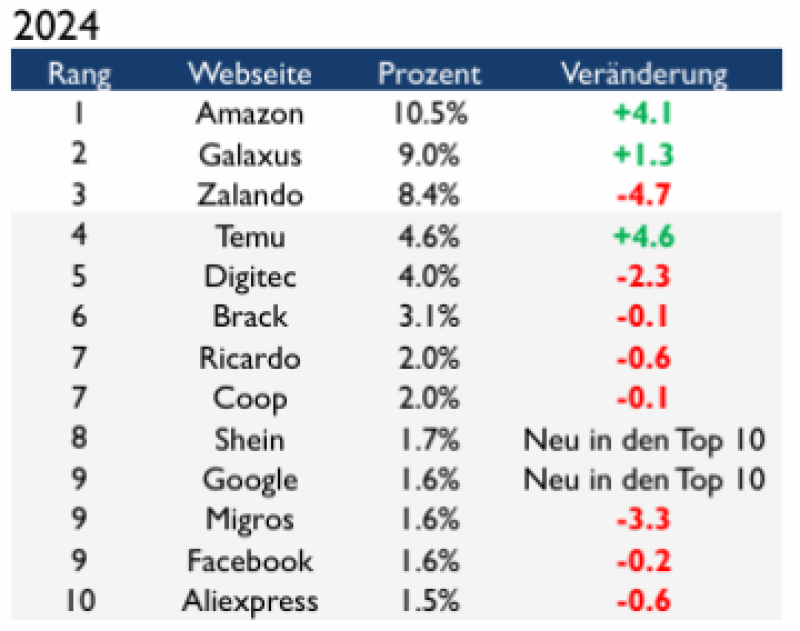 根據瑞士圣加侖大學的研究數據,過去12個月內,瑞士消費者最常使用的中國跨境平臺是Temu、Shein和AliExpress,它們的排名分別為第四、第八和第十。