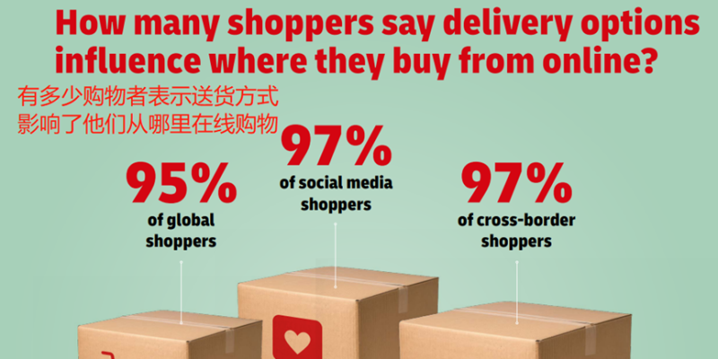 一份來自DHL對全球24個國家的12000名消費者的調查顯示,高達95%的全球消費者都認為物流配送的方式會決定他們在哪個平臺上進行購物。而在那些社交電商消費者和跨境電商消費者群體中,這一比例還要更高,達到97%。