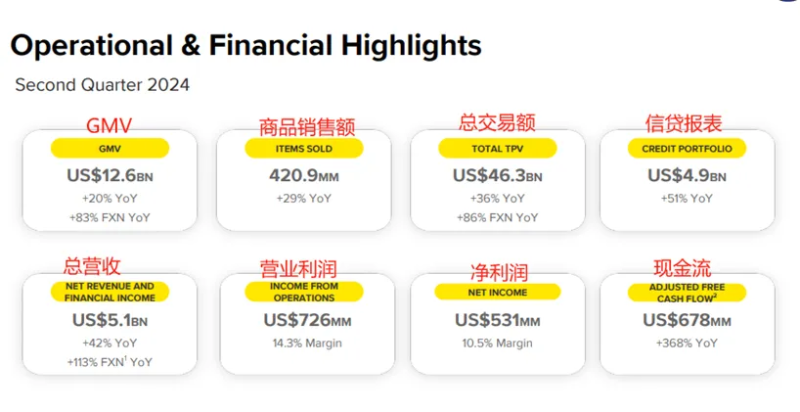 今年年中,從美客多發(fā)布的2024年第二季度的業(yè)績財報中可以看到,美客多已經(jīng)實現(xiàn)營業(yè)收入51億美元,與去年同期相比上漲42%;平臺GMV達到126億美元,同比暴漲20%,營業(yè)利潤達到7.26億美元,凈利潤更是實現(xiàn)103%的驚人增率,達到5.31億美元。