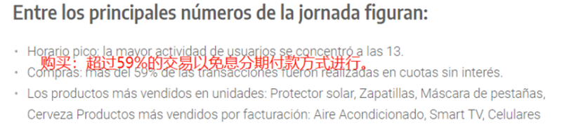 從品類來看,今年網一大促最受阿根廷消費者歡迎的產品是防曬霜、運動鞋、睫毛膏、啤酒、空調、智能電視和手機等。相較于去年同期,今年銷量增長最快的產品則是超市雜貨(53%)、健康與運動產品(48%)、電子產品和家用電器(46%)以及時尚美容產品(39%)。