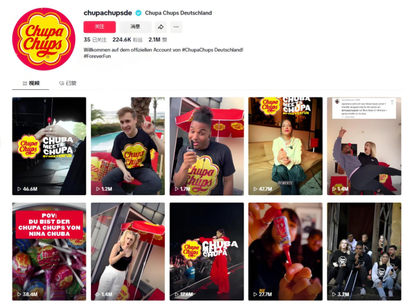 Chupa Chups,一個源自西班牙巴塞羅那的糖果品牌,充分借勢TikTok抓住機會得以在全球消費市場上名聲大噪。目前,該品牌的官方TikTok賬號收獲了20多萬的粉絲,視頻播放量相當可觀,幾乎都在百萬級別以上。并且該品牌還成功占據了全球超過25%的棒棒糖市場份額,年銷量以十億記,產品暢銷全球數個國家,男女老少通吃。