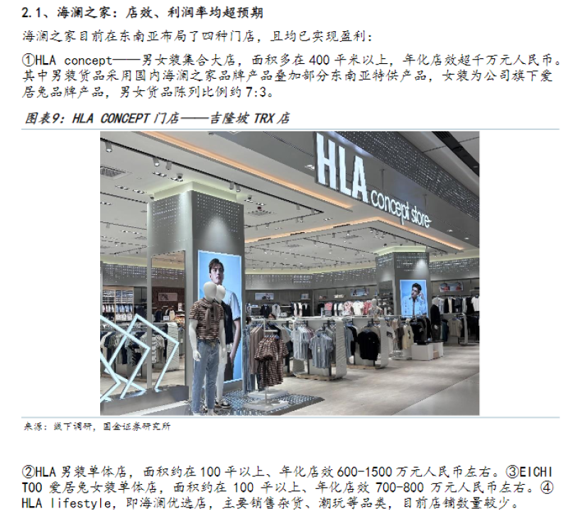 根據(jù)國金證券的調(diào)研報告,海瀾之家目前已在東南亞布局了四種門店,且均已實(shí)現(xiàn)盈利。其中男女裝集合門店面積多在400平方米以上,年化店效超千萬人民幣;