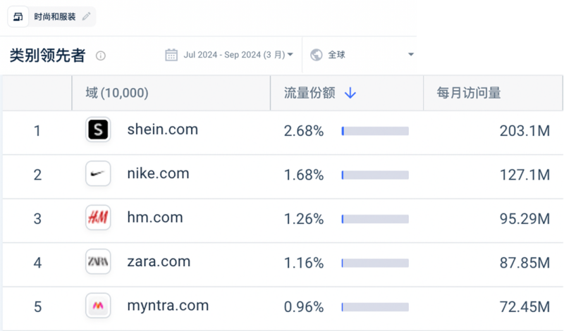 根據(jù)數(shù)據(jù)分析網(wǎng)站Similarweb統(tǒng)計,今年第三季度,快時尚品牌Shein官網(wǎng)的全球訪問量刷新記錄,月均訪問人次超2億,在服裝與時尚類目中排名第一,流量份額占比相較排名第二的NIKE足足高出1%,可謂是一騎絕塵。