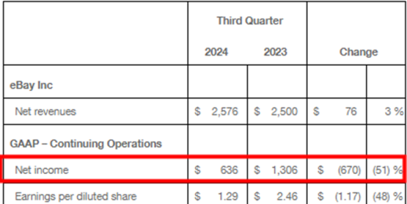 上月,eBay公布了2024年第三季度財報。三季度eBay凈收入為25.76億美元,相較于去年同期增長了3%;GMV(商品交易總額)為183億美元,按報告基礎(chǔ)計算同比增長2%;凈利潤為6.36億美元,同比大幅下跌了51%;調(diào)整后每股收益為1.19美元,高于市場預(yù)期的1.18美元。