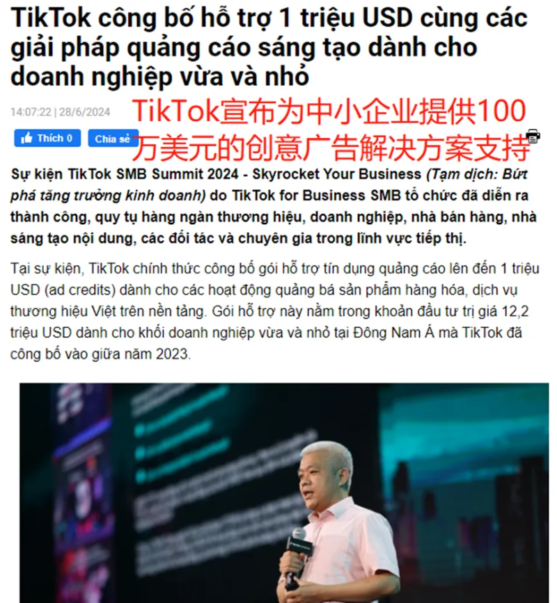 在越南市場,TikTok Shop計劃在今年年底前投入大約100萬美元,為超過1萬家越南中小企業(yè)提供廣告支持;同時,TikTok Shop還將為這些企業(yè)提供專業(yè)培訓(xùn),幫助他們更好地利用廣告營銷,打開品牌知名度。