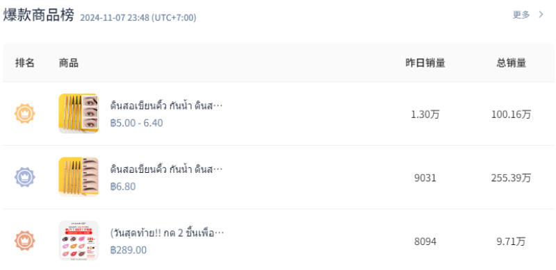 義烏麥歐麗網絡科技有限公司的一款MYONLY防水眉筆便是一個生動例子。根據FastMoss數據,昨天(11月7日)的TikTok Shop泰國站爆款商品榜中,位列前二的均為MYONLY防水眉筆,排名第一的小店單日銷量達1.3萬件,排名第二的小店銷量為9031件。