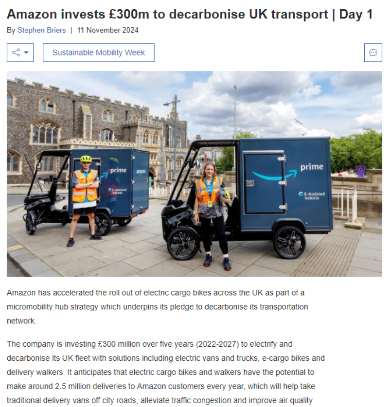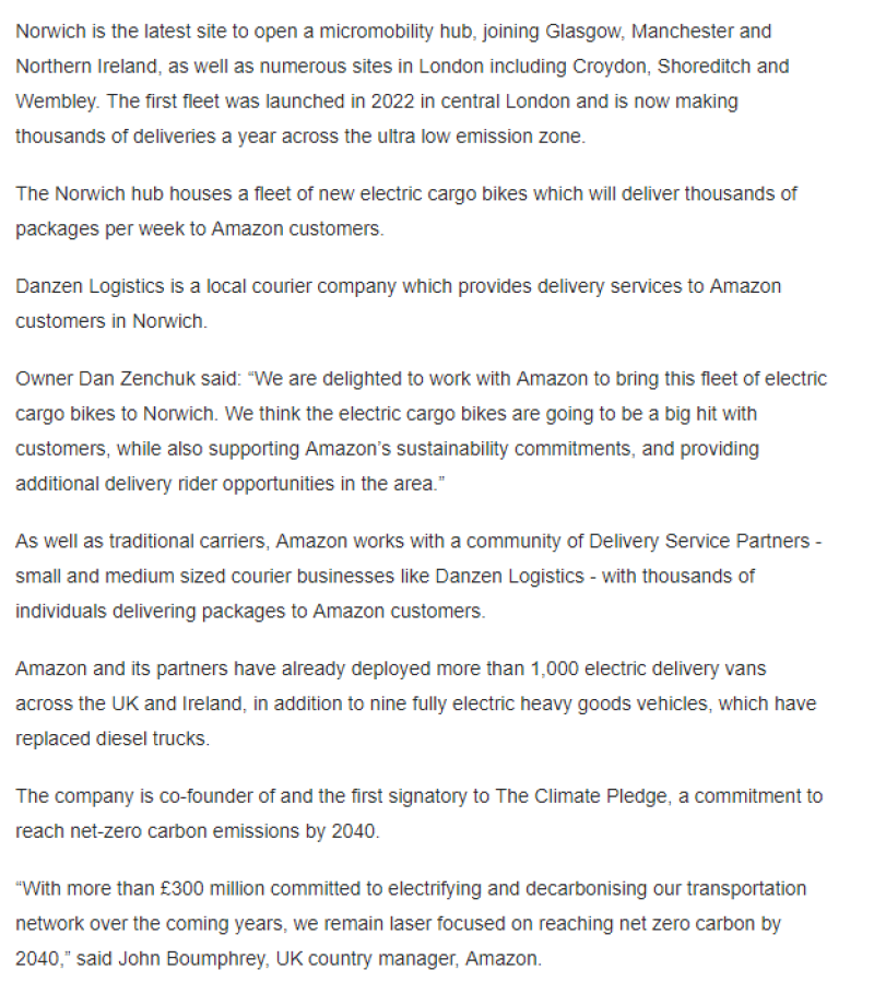 繼倫敦、曼徹斯特、格拉斯哥等地之后,諾維奇成為最新開設微型交通樞紐的城市,每周將通過電動貨運自行車向亞馬遜客戶運送數千件包裹。亞馬遜預計,通過電動貨運自行車和送貨步行器等方案,每年可完成約250萬件貨物的配送,從而減少對傳統送貨車的依賴,減輕道路擁堵并改善空氣質量。