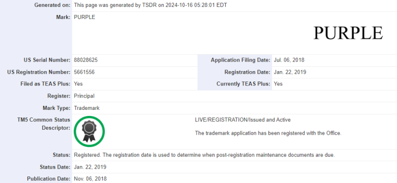 案件信息顯示,Purple認(rèn)為被告侵犯了其名下的11項(xiàng)商標(biāo)和7項(xiàng)外觀專利,其中一個(gè)商標(biāo)還是常用顏色詞“PURPLE”。這意味著,其他賣家若是在注冊(cè)類目中(毯子、床架、枕頭等)使用該詞,其行為將被視為侵權(quán)。