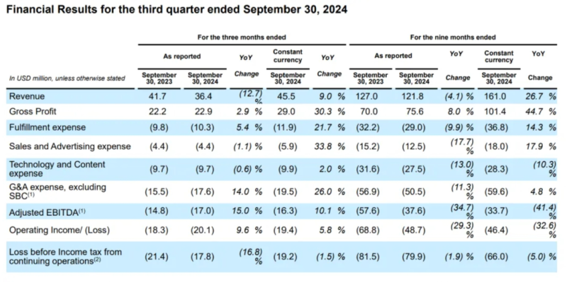日前,Jumia公布了2024年第三季度財報。根據報告,Jumia第三季度收入為3640萬美元,同比下降13%;商品交易總額(GMV)為1.6億美元,同比下降1%;營業虧損為2010萬美元,同比增長10%。