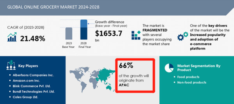 近日,研究機構Technavio公布了一份關于全球在線雜貨市場的最新報告。報告數據顯示,當前全球在線雜貨市場正在以驚人的速度增長著,預計在2024——2028年間,這一市場的規模會以21.48%的復合年增長率不斷擴大,4年內增長足足1.65萬億美元。