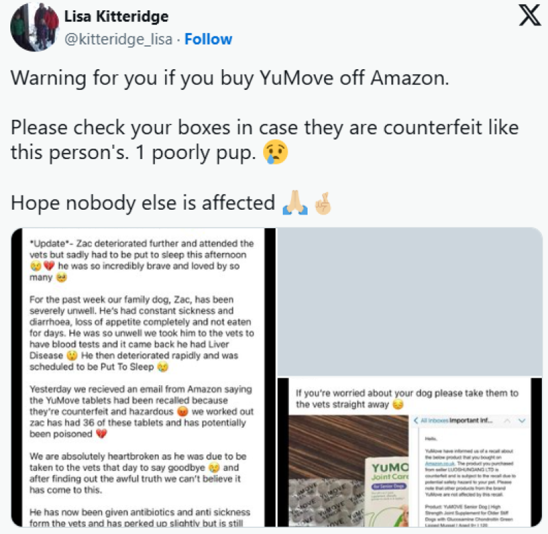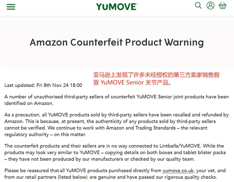同時Lintbells還強調,YuMove正品只能通過官方渠道購買,比如亞馬遜官方YuMove商店、獸醫和其他主要零售商處。鑒于市場上存在多個假冒版本,目前還沒有確定假冒產品的可靠檢測方法。