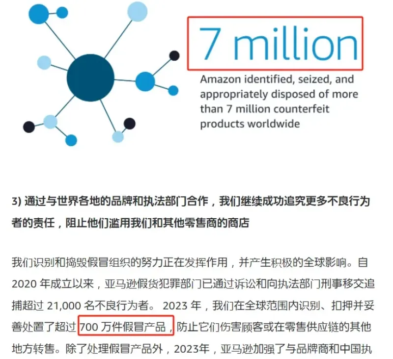 好在各大電商平臺和相關部門為了維持行業規范秩序發展,打假起來也是毫不手軟。例如2023年亞馬遜在全球發現、查獲并妥善處理了超過700萬件假貨,并支持和配合中國執法部門成功開展了50多次執法行動,逮捕涉案人員上百人。