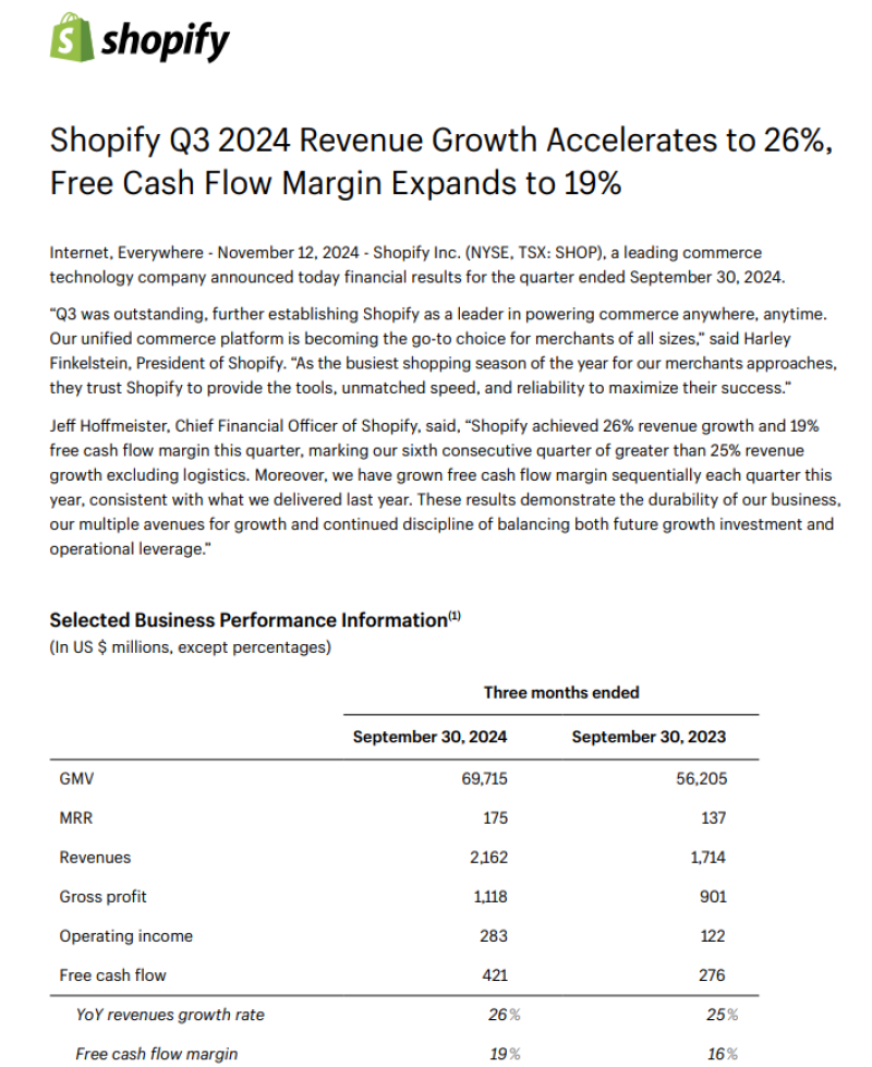 11月13日消息,Shopify公布2024年第三季度財報。財報顯示,Shopify第三季度營收為21.6億美元,同比增長26%;GMV達697億美元,同比增長24%;毛利潤11.2億美元,同比增長24.1%;毛利率為51.7%,而去年同期為52.6%;自由現金流為4.2億美元,利潤率為19%。