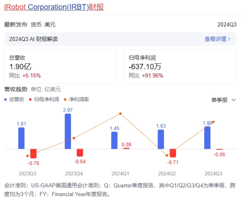 據(jù)iRobot發(fā)布的Q3的財報顯示,2024財年前三財季累計收入5.10億美元,對比去年同期的5.83億美元,同比減少12.56%;累計凈虧損6841.00萬美元,去年同期累計凈虧損為2.41億美元,同比縮小71.63%。
