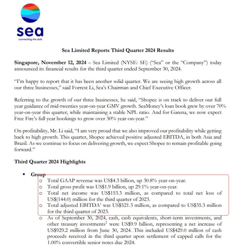11月13日消息,Shopee母公司Sea發(fā)布2024年第三季度財務報告。財報顯示,Sea第三季度營收達43.3億美元,同比增長30.8%;凈利潤1.53億美元,去年同期凈虧損1.44億美元;調(diào)整后EBITDA達5.21億美元;每股收益達0.24美元。